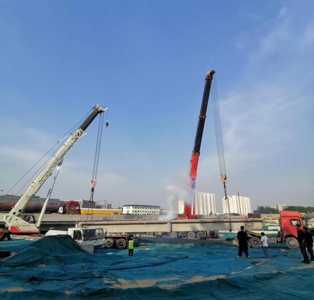 2020年04月23日在距離連霍高速柳林出口10公里處的連霍高速公路與龍源十三街立交橋上,一臺超大型架梁機械正把1榀60余噸重的預制箱梁緩緩吊起。在經(jīng)過運梁車和第二臺架梁機械的精準配合后,預制箱梁被緩緩放置在龍源十三街與連霍高速南側(cè)的兩個高架橋墩上。就此,龍源十三街與連霍高速南側(cè)的第一榀箱梁正式完成架設,這標志著龍源十三街與連霍高速南側(cè)的施工已由下部結(jié)構(gòu)轉(zhuǎn)入上部結(jié)構(gòu)。