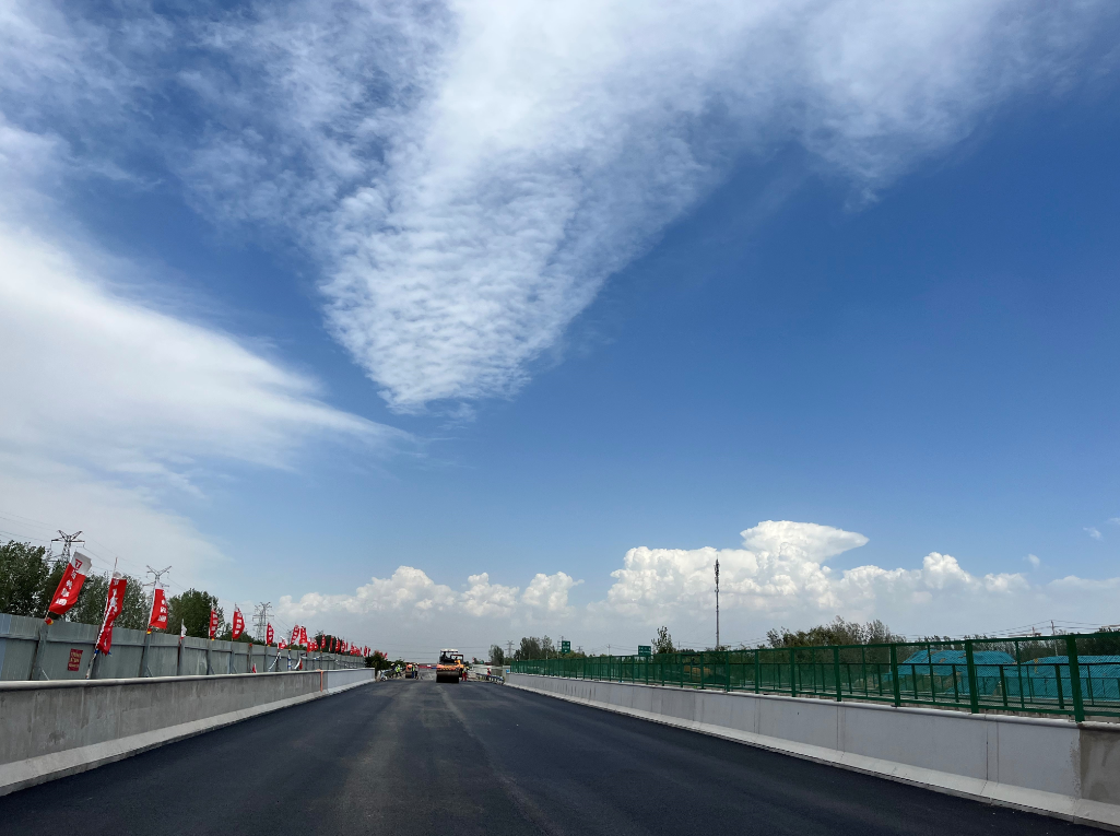 2022年6月13日,鄭東新區(qū)明理路與連霍高速公路立交工程施工現(xiàn)場,機器轟鳴,施工人員頂著烈日和路面蒸騰的熱氣,有條不紊地進行瀝青混合料攤鋪施工。